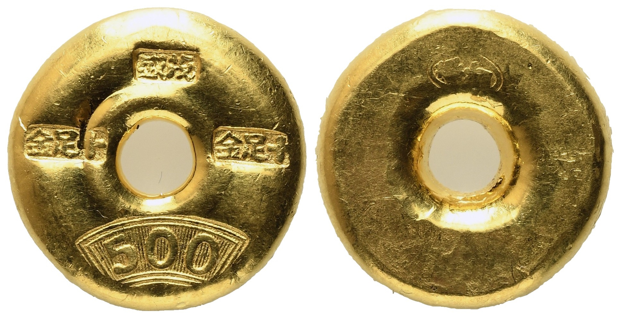 CINA. Lingotto in oro titolo 999 (18,75 g) di forma circolare da mezzo tael. Periodo della Repubblica Cinese (Min Guo). Iscrizioni in cinese recanti la manifattura e il peso "500". Buone condizioni.