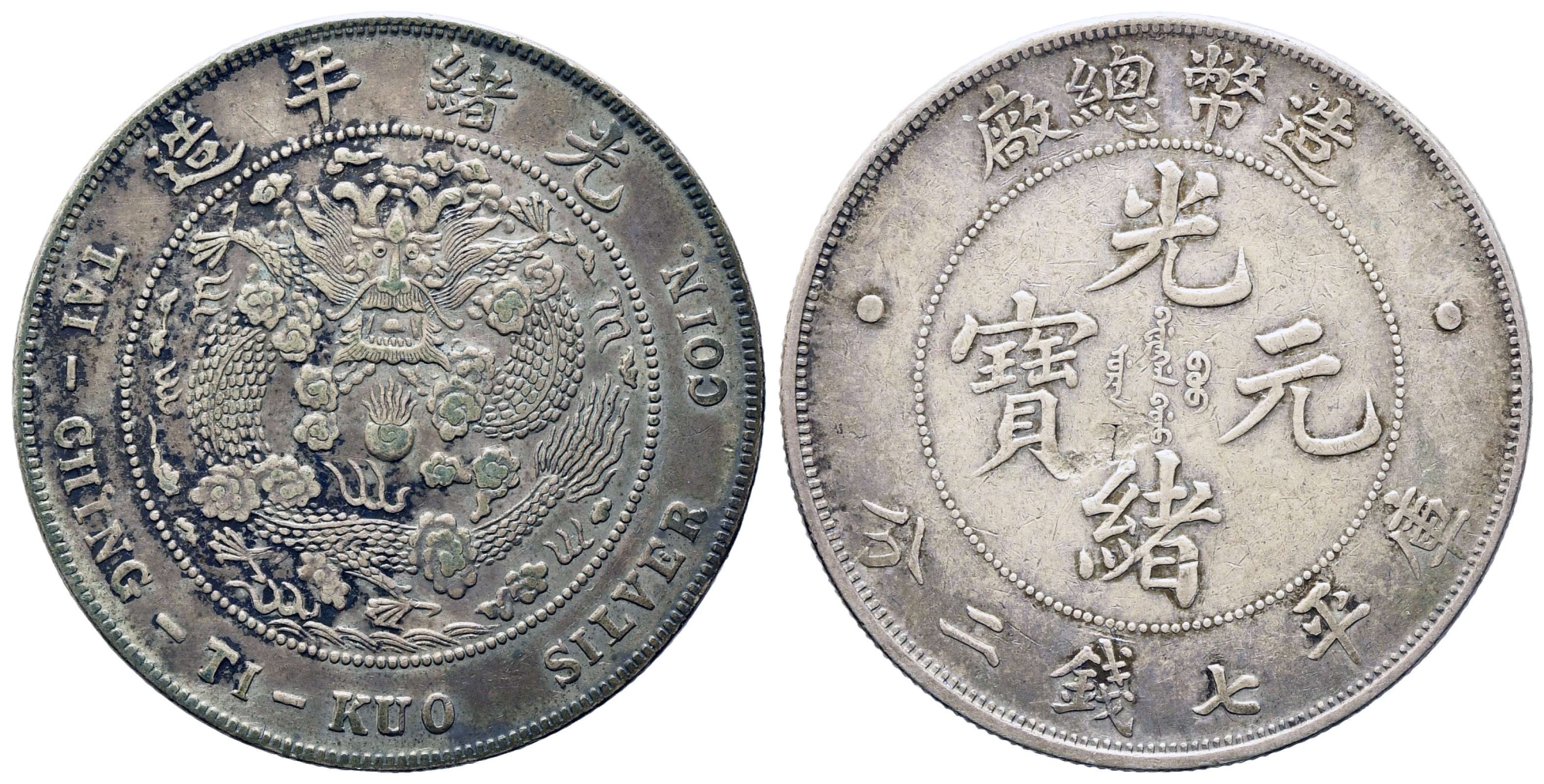 CINA - IMPERO. Dollaro s.d. (1908) Tai-Ching-Ti-Kuo. Kann 216 Kr. Y 14 - Tiensin. Ag (26,79 g). Difetto di laminazione al centro del R/ . Chopmark (?) . Molto Rara. BB/SPL