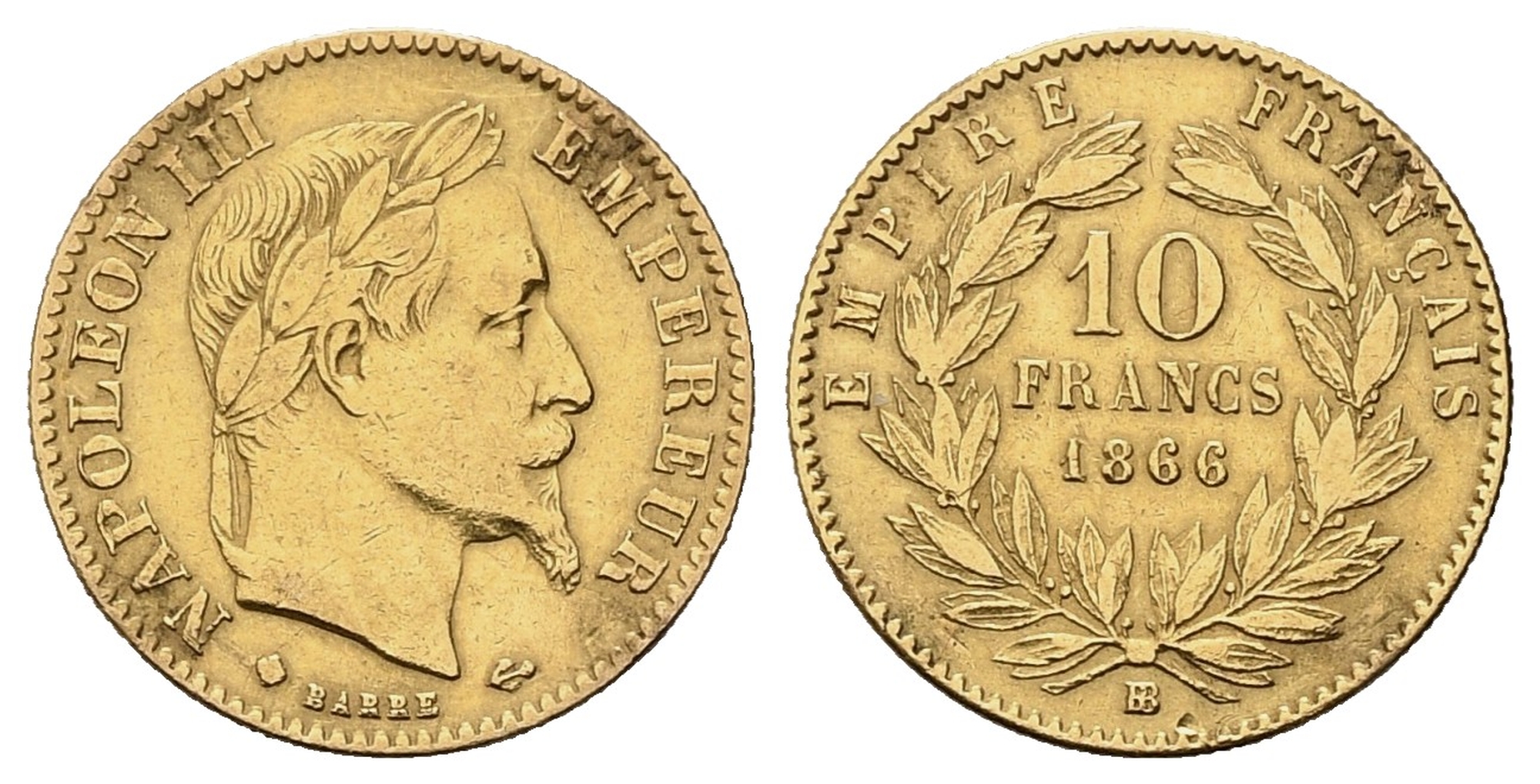 FRANCIA. Napoleone III (1852-1870). 10 franchi 1866. Strasburgo. Au (18,80 mm – 3,20 g). BB