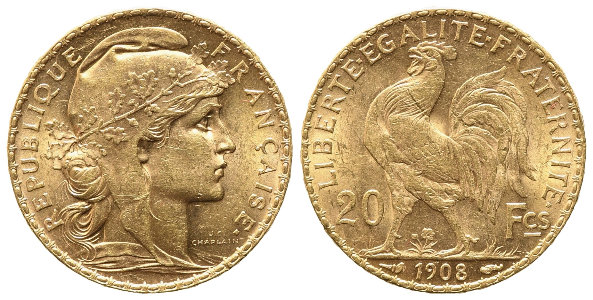 FRANCIA. Terza Repubblica (1870-1940). 20 Franchi 1908. Au (6,45 g). SPL/qFDC