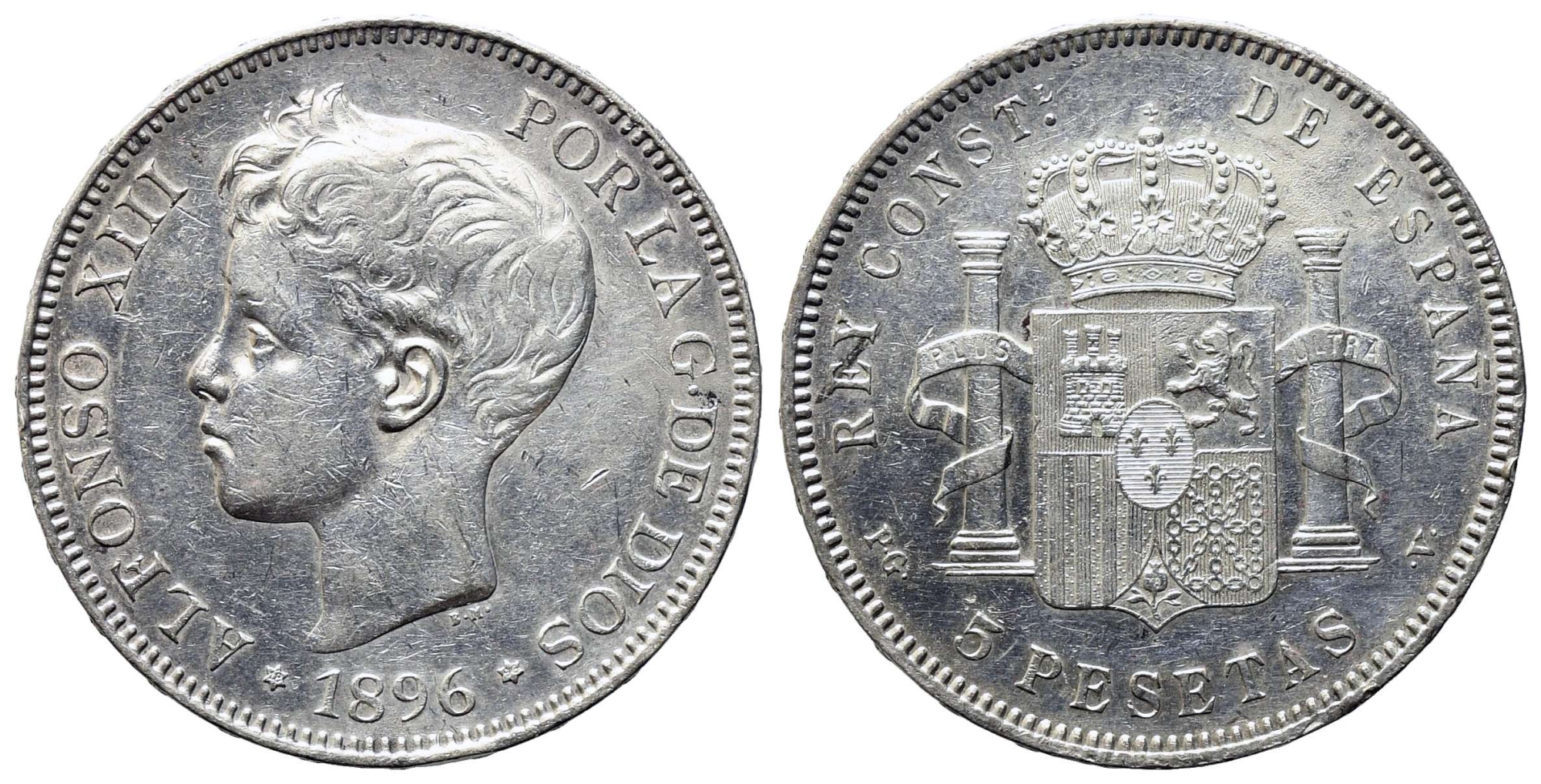 SPAGNA. Alfonso XIII (1886-1931). 5 pesetas 1896. Ag. SPL, colpetto al bordo.