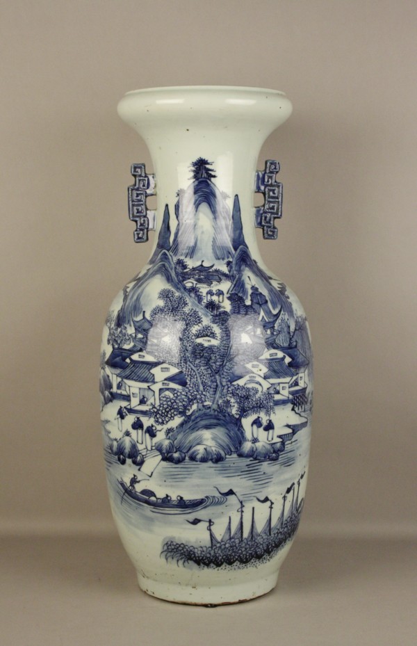 Firmato, datato. Vaso in porcellana bianca e blu. Cina. XIX secolo. Mis. Alt. cm. 58 ca.