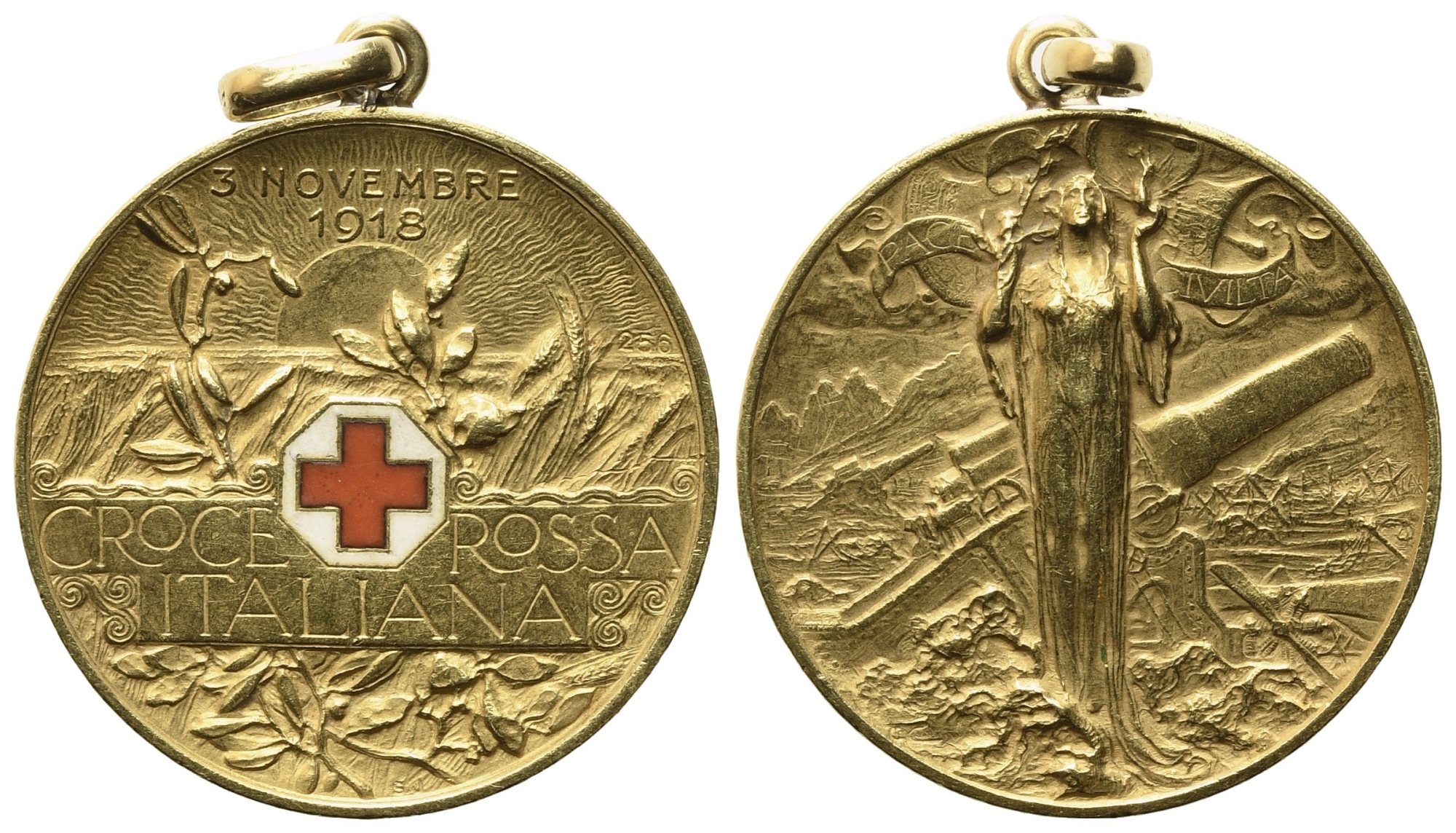 REGNO D'ITALIA. Vittorio Emanuele III (1900-1943). Croce Rossa Italiana. Medaglia Croce Rossa 3 novembre 1918. Au (14,91 g). Cavazzoni 17. RRRR, con appiccagnolo aggiunto anch'esso in oro. Smalti integri.