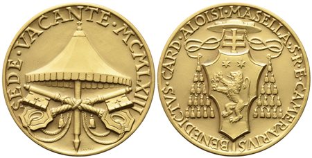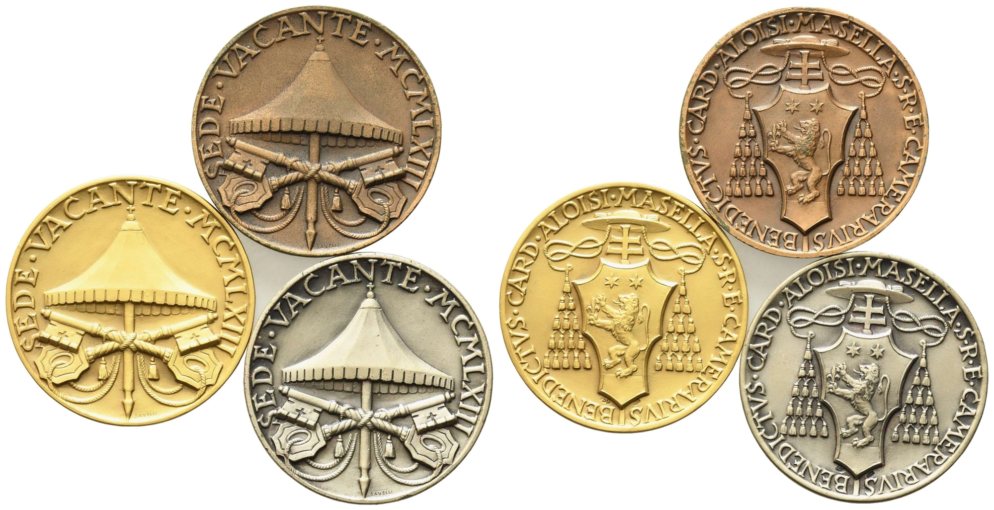 CITTA' DEL VATICANO. Sede Vacante. Trittico di medaglie 1963 Camerlengo Cardinale Benedetto Aloisi Masella. Opus Aurelio Mistruzzi (Au 29,57 g; Ag 27,26 g; Ae 25,60 g). FDC