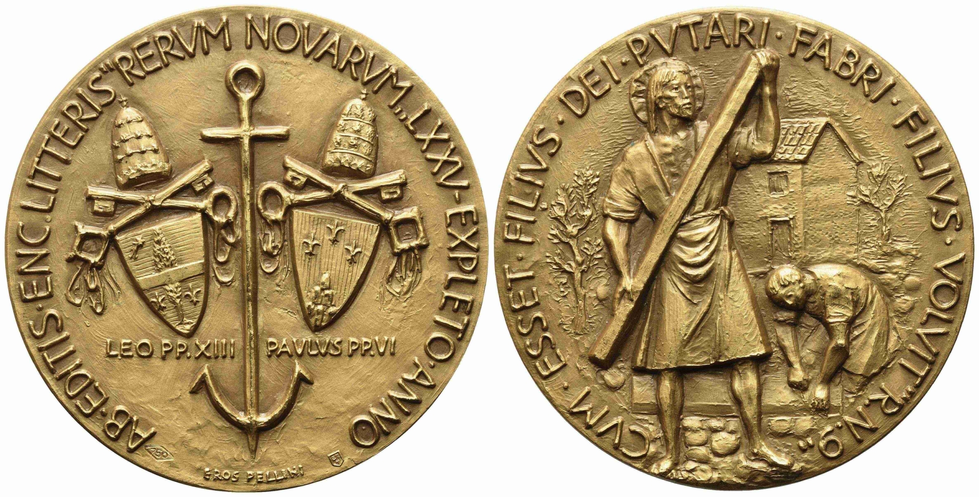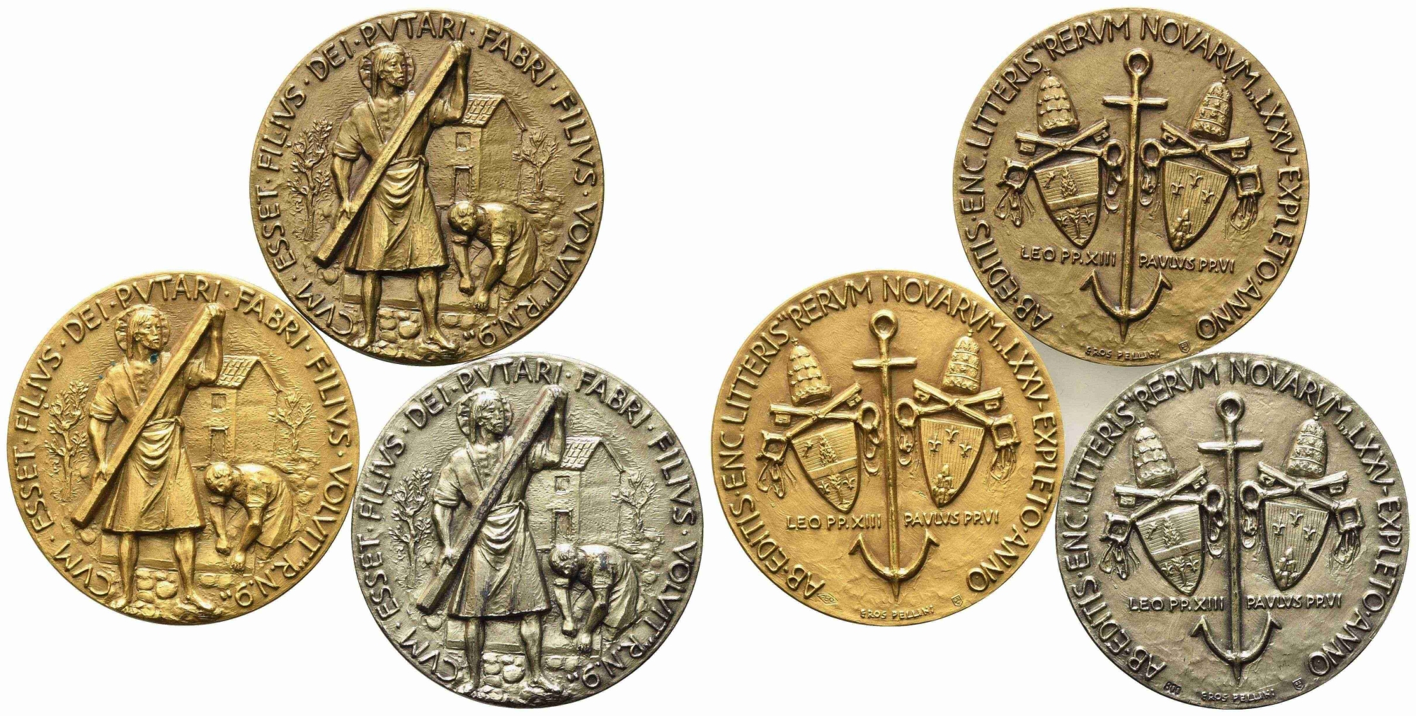 CITTA' DEL VATICANO. Paolo VI (1963-1978). Trittico di medaglie 75° Anniversario Enciclica Rerum Novarum 1966 (Au 52,51 g; Ag 45,52 g; Ae 36,55 g). FDC