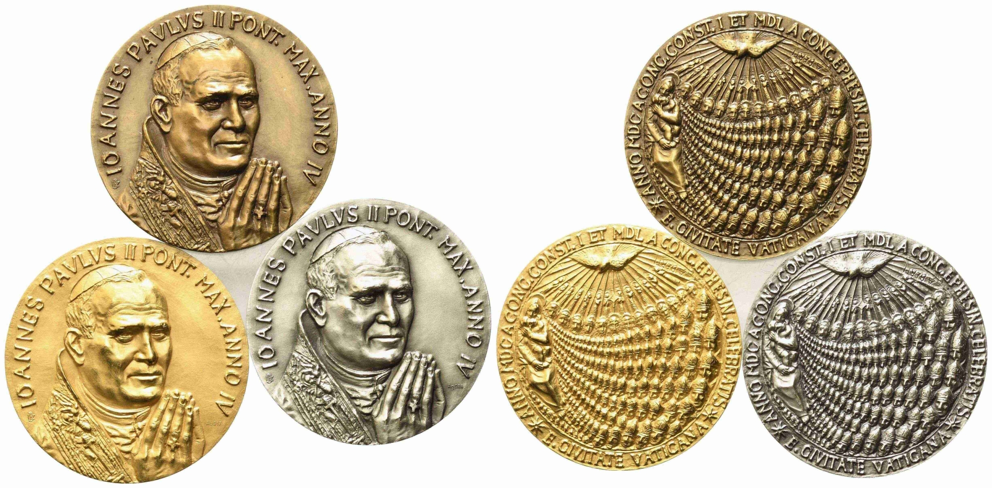 CITTA' DEL VATICANO. Giovanni Paolo II (1978-2005). Trittico di medaglie Anno IV (Au 52,43 g; Ag 40,05 g; Ae 40,44 g). FDC