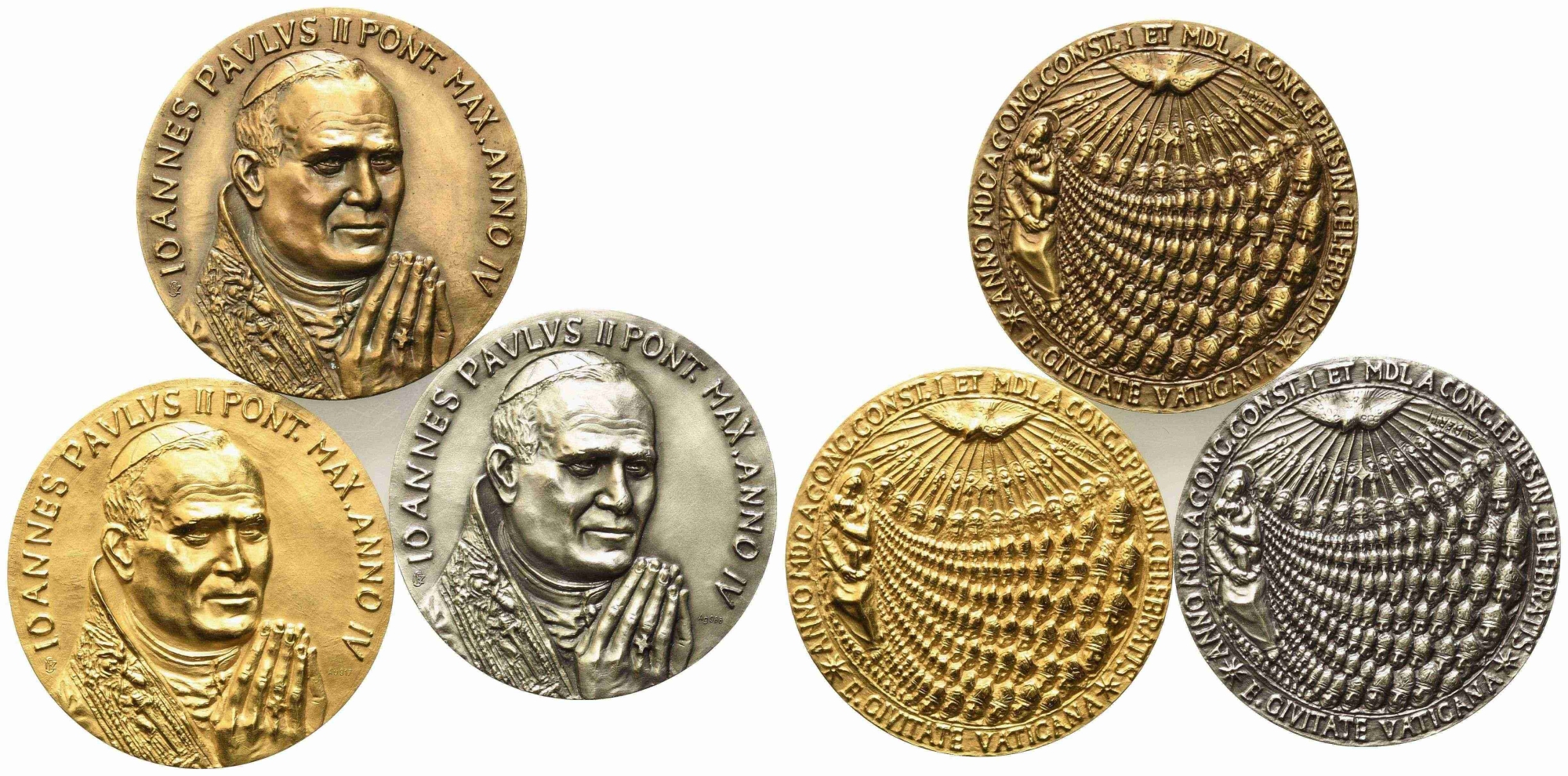 CITTA' DEL VATICANO. Giovanni Paolo II (1978-2005). Trittico di medaglie Anno IV (Au 52,25 g; Ag 40,63 g; Ae 40,19 g). FDC