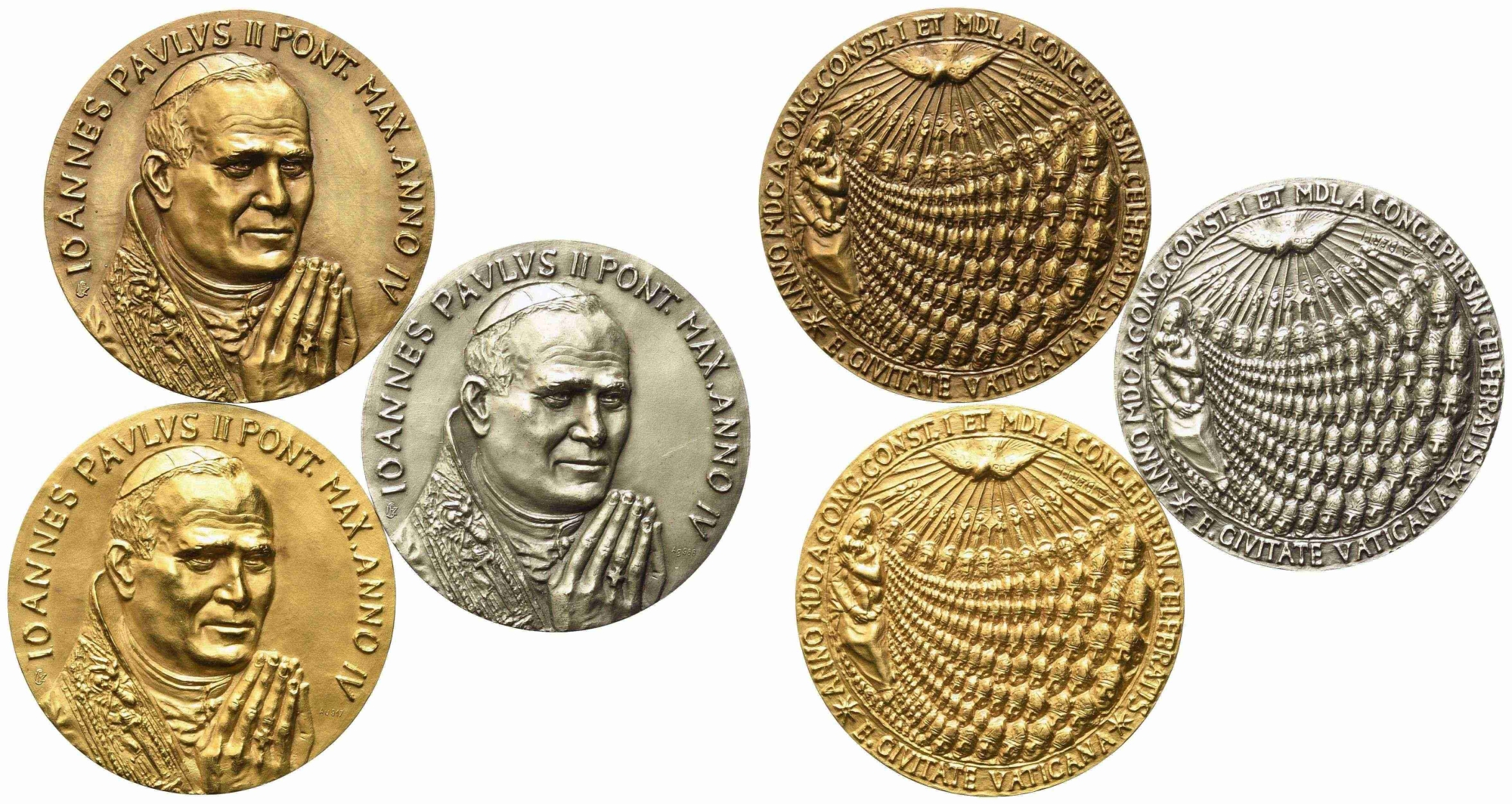 CITTA' DEL VATICANO. Giovanni Paolo II (1978-2005). Trittico di medaglie Anno IV (Au 52,27 g; Ag 40,10 g; Ae 40,25 g). FDC