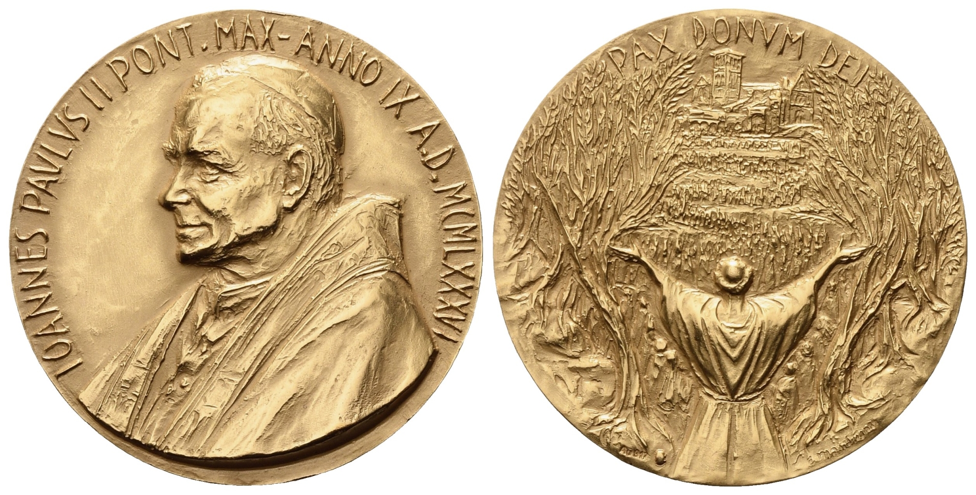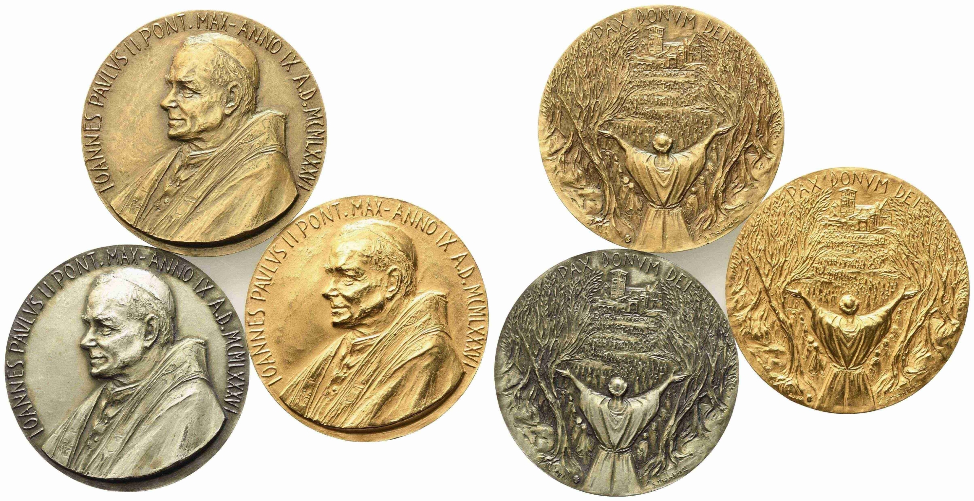 CITTA' DEL VATICANO. Giovanni Paolo II (1978-2005). Trittico di medaglie Anno IX (Au 54,00 g; Ag 38,24 g; Ae 38,64 g). Con cofanetto originale. FDC