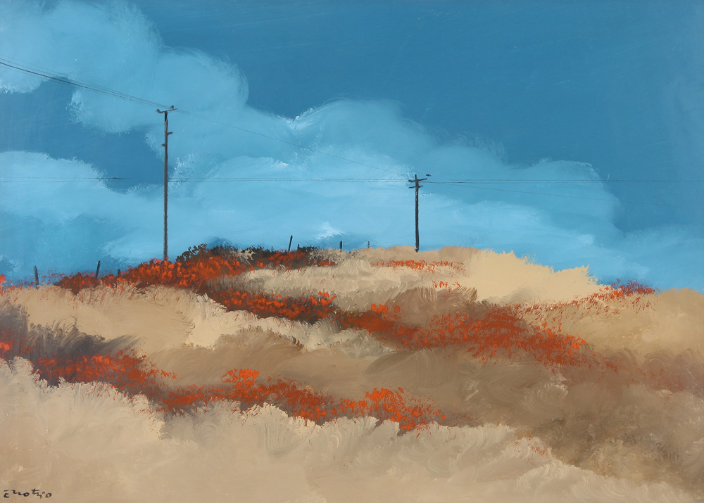ENOTRIO Buenos Aires 1920 - Pizzo Calabro (Cz) 1989 Campo di grano olio su tavola cm. 50x70, firma in basso in basso, firma, titolo, archivio, timbro dell'artista e timbro della Galleria La Barcaccia (Chianciano Terme) al retro.