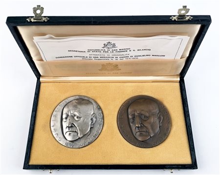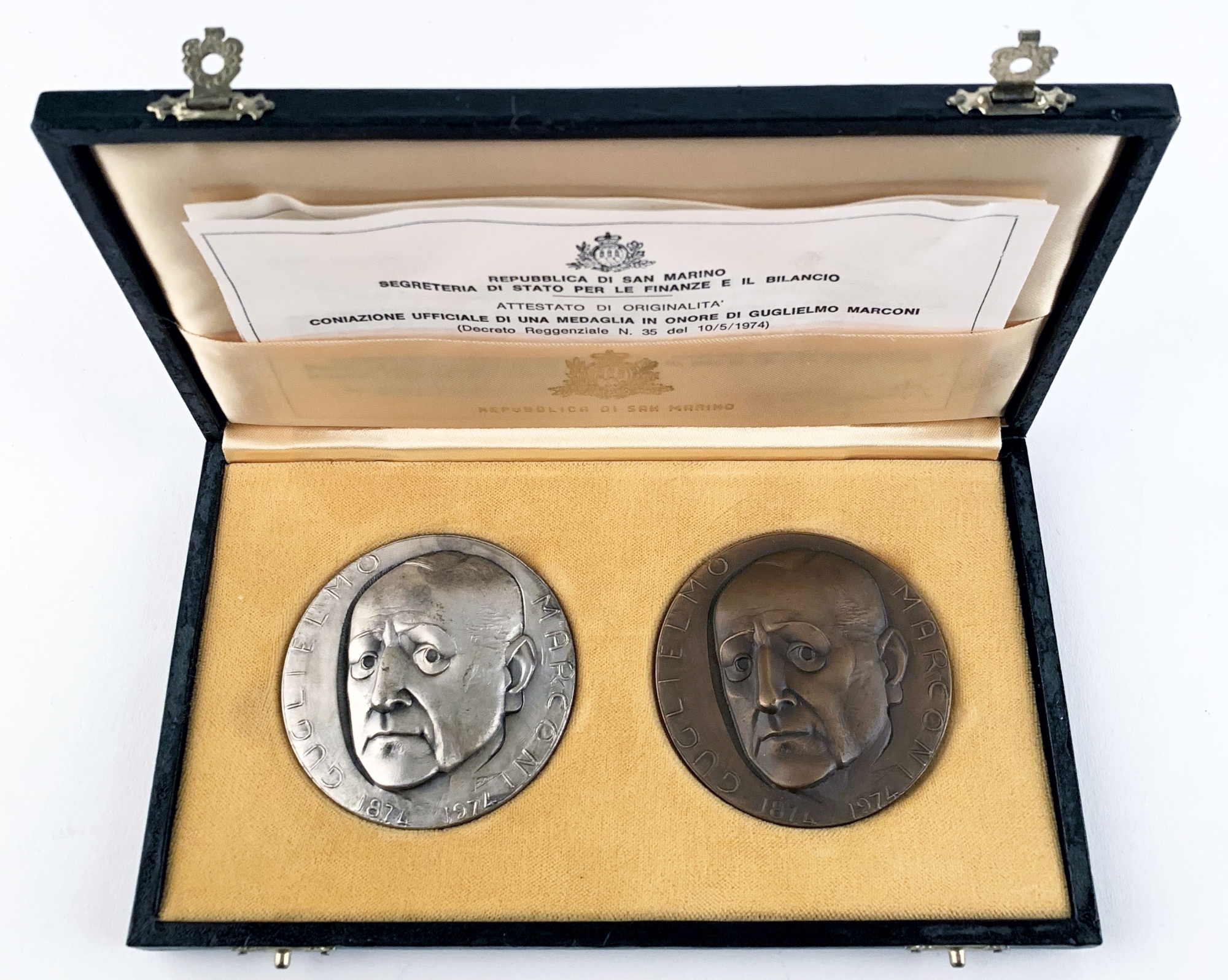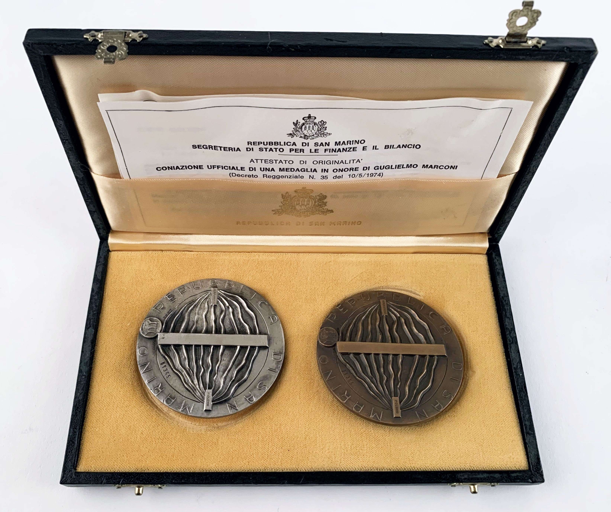SAN MARINO. Dittico Medaglie G. Marconi centenario della nascita 1974. Ag (60 mm – 130 g), Ae (60 mm). In astuccio della Zecca. FDC
