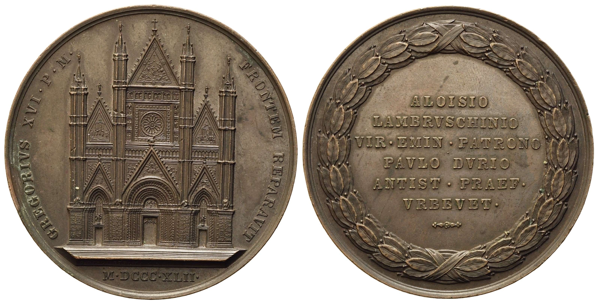 ORVIETO. Regnando Gregorio XVI (1831–1846). Medaglia straordinaria 1842/ XII per i restauri al Duomo di Orvieto. Opus G. Girometti. Ae (56 mm – 96,15 g). GREGORIVS XVI.P.M. – FRONTEM REPARAVIT. La facciata del Duomo di Orvieto; all’esergo, nel taglio, G. GIROMETTI.F.; sotto M.DCCC.XLII. R/ ALOISIO/ LAMBRVSCHINIO/ VIR EMIN PATRONO/ PAVLO DURIO/ ANTIST PRAEF/ VRBEVET in corona d’alloro. Boccia 158; Patrignani 79. qFDC
