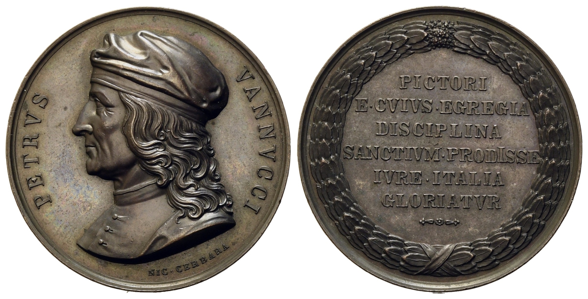 PERUGIA. Pietro Vannucci (1450-1523). Medaglia. Opus N. Cerbara. Ae (41 mm). PETRVS VANNVCCI, Busto a sn. R/ PICTORI E CVIVS EGREGIA DISCIPLINA SANCTIVM PRODISSE IVRE ITALIA GLORIATVR in ghirlanda. SPL