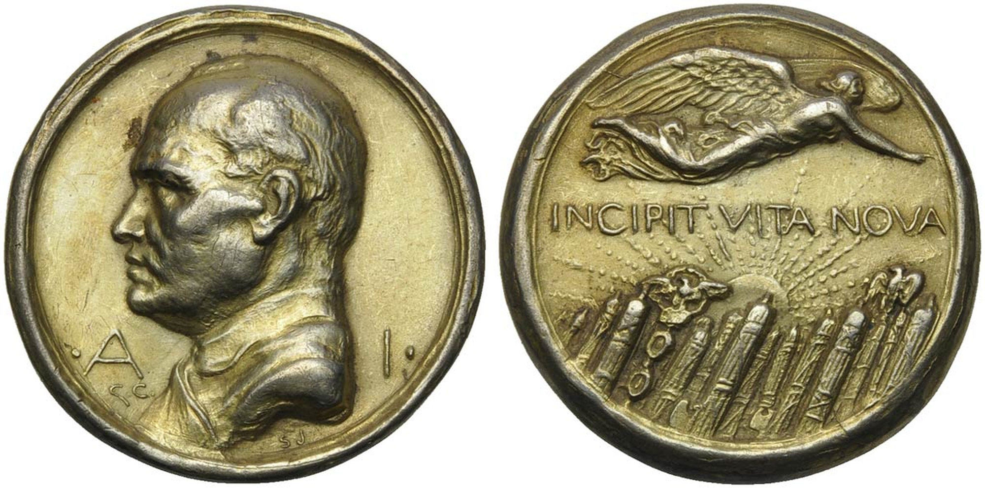 REGNO D'ITALIA - FASCISTE. Medaglia 1923 A. I. Decennale del PNF. Busto del Duce a s. R/ INCIPIT VITA NOVA Vittoria in volo a d., sotto fasci e aquile legionarie. Opus Castiglioni. Ag (29 mm). Cas. I/23. SPL