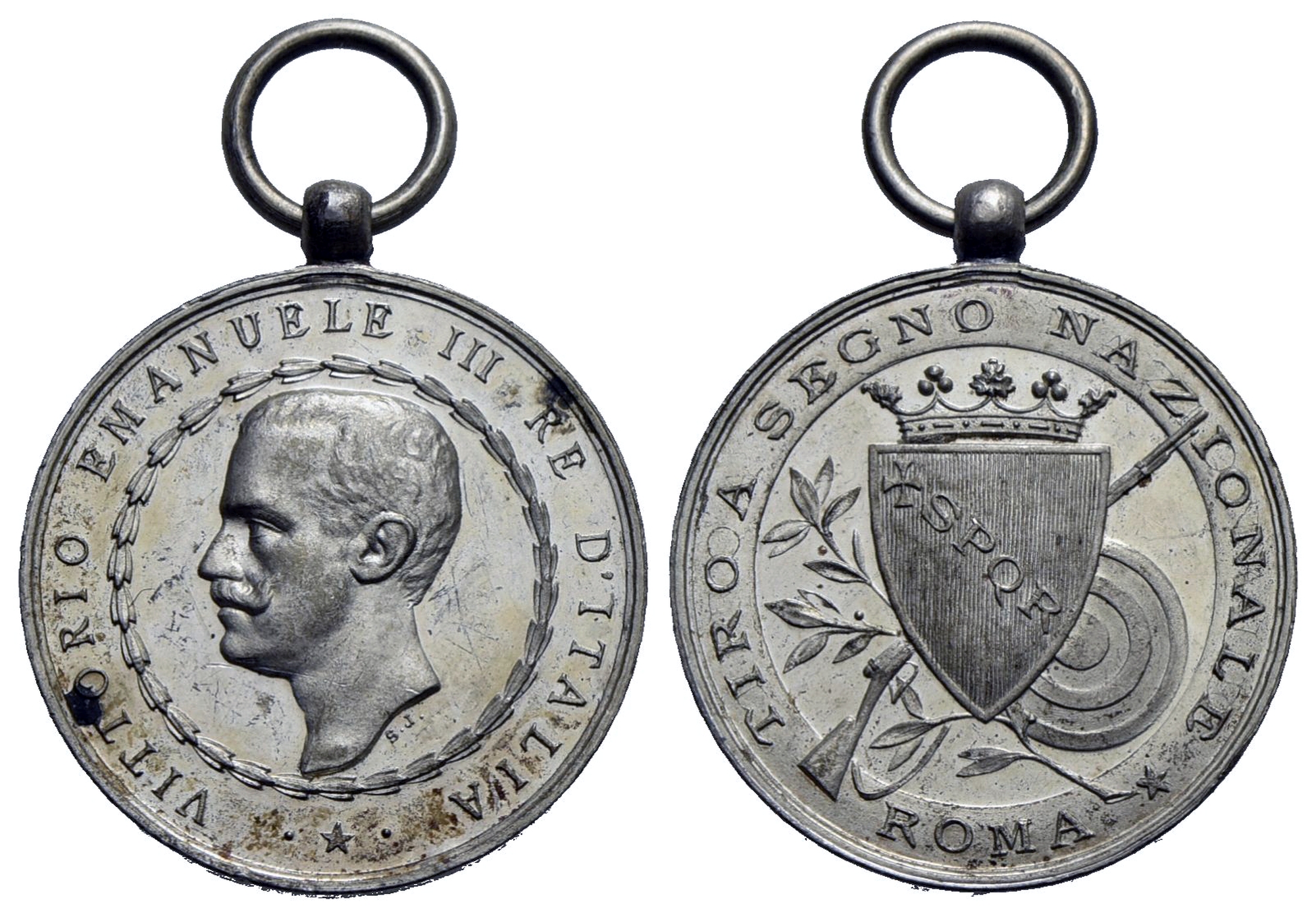 REGNO D'ITALIA. Vittorio Emanuele III (1900-1943). Medaglia con appiccagnolo e anello. Tiro a segno nazionale, Roma. Testa a sn. R/ Scudo coronato su fucile, ramo di ulivo e bersaglio. Opus S.J. Metallo bianco (25 mm). In scatola originale con chiusura rotta. qFDC