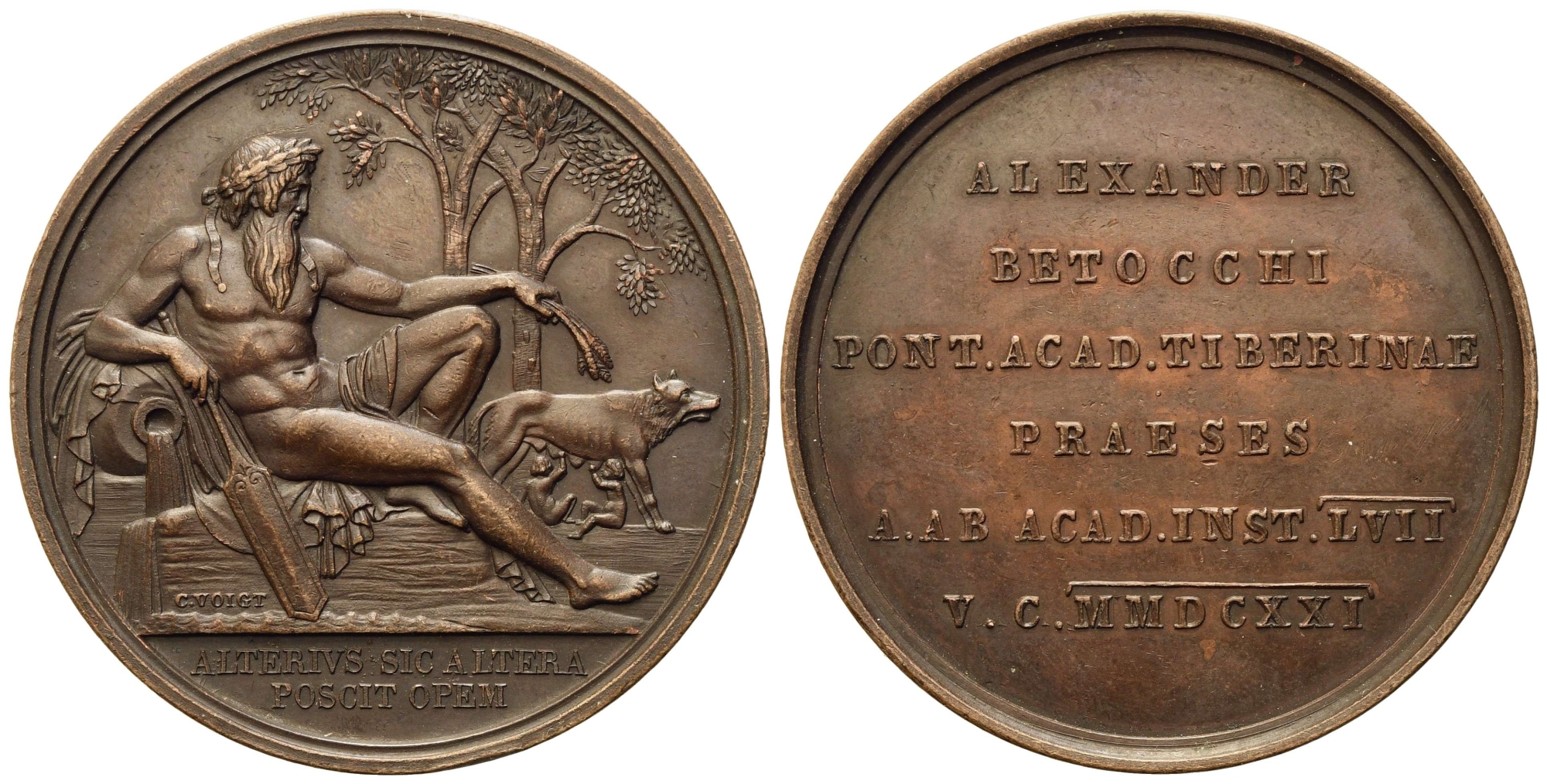 ROMA. Medaglia. D/ALTERIVS SIC ALTERA / POSCIT OPEM su due righe in esergo; Il dio del fiume Tevere sdraiato sotto gli alberi; davanti a lui, la lupa capitolina che allatta i fondatori della città, Romolo e Remo. R/ALEXANDER / BETOCCHI / PONT.ACAD.TIBERINAE / PRAESES / A.AB ACAD.INST.LVII / V.C.MMDCXXI su sei righe. Opus C. Voigt (1800-1874). Ae (44,8 mm – 38,7 g). SPL