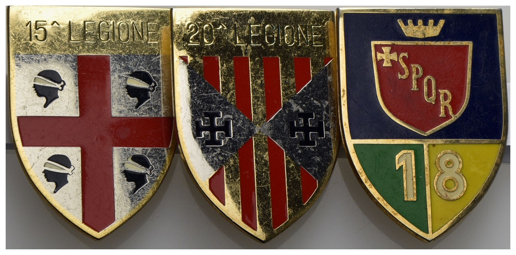 ITALIA. Distintivo. MILANO. Guardia di Finanza 15° (4 Mori bendati). 18° (SPQR) e 20° legione. Opus Bomisa. Ae dorato smaltato (31x44 mm). Lotto di tre pezzi diversi. Ottimo