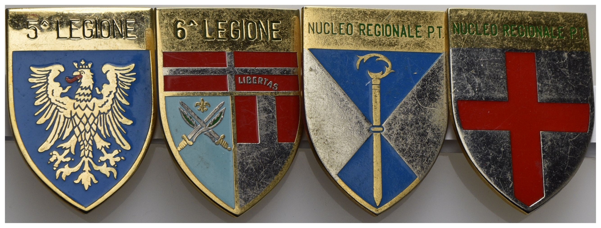 ITALIA. Distintivo Guardia di Finanza 5° (aquila spiegata su smalto azzurro), 6° legione e Nucleo Regionale P.T. (2 diversi) Opus Bomisa. Milano. Ae dorato smaltato (31x44). Lotto di 4 pezzi diversi. Ottimo.
