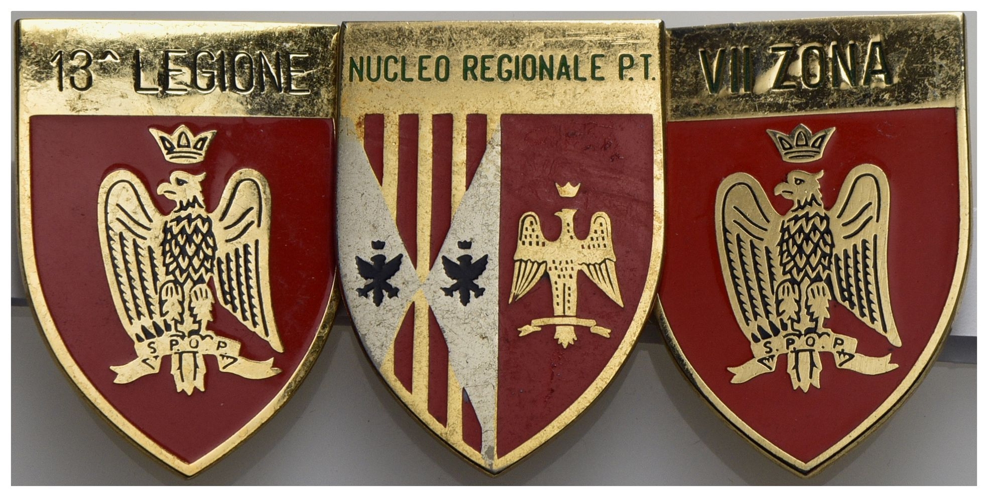ITALIA. Distintivo. Guardia di Finanza Palermo 13° legione, VII zona e Nucleo Regionale P.T. Opus Bomisa. Milano. AE dorato smaltato (31x44 mm). Lotto di tre pezzi diversi. Ottimo.