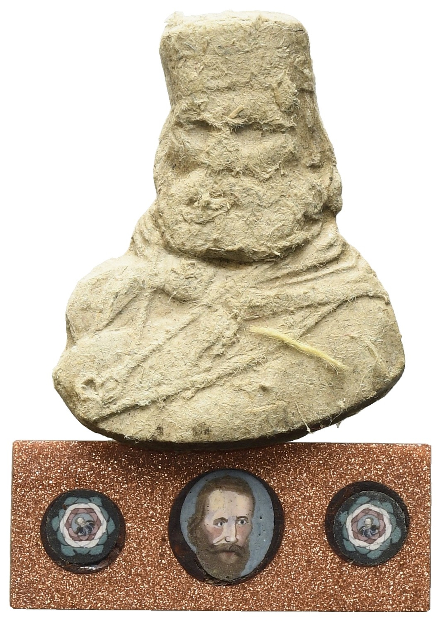 VARIE. Insieme risorgimentale composto da una targhetta in resina e micromosaico dipinta a mano e da un busto in cartone pressato di Garibaldi (4x3mm / 3x2mm).
