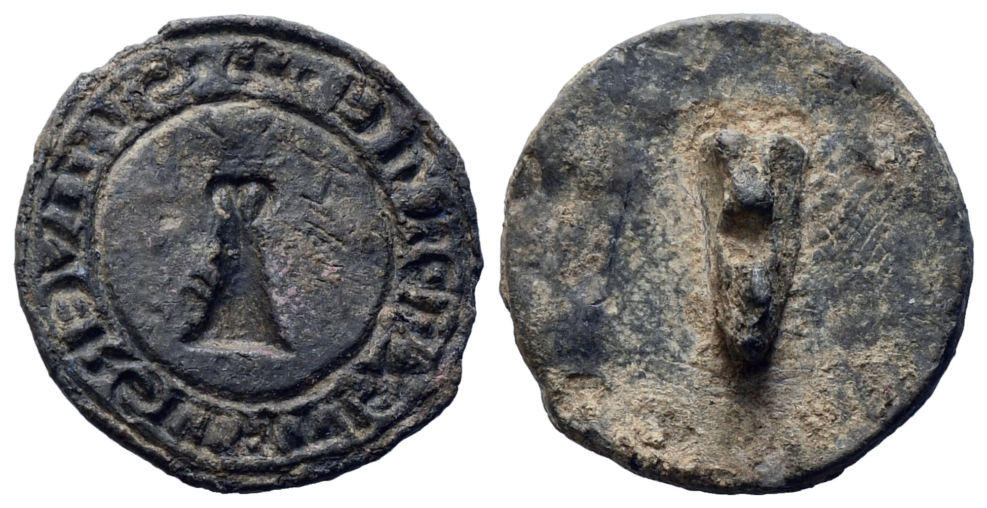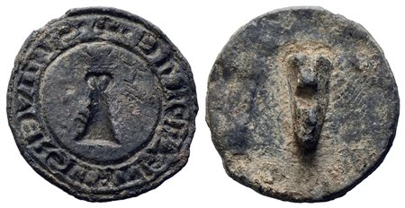 VARIE. Sigillo circolare in piombo con appiccagnolo posteriore frammentato. +S VNIVERSITATI CAMPANE Campana (30 mm). XIV secolo.