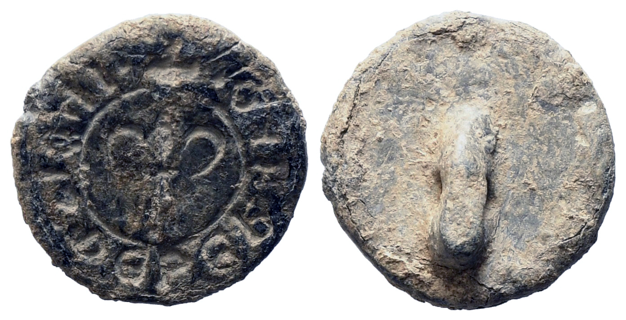 VARIE. Sigillo circolare in piombo con pinna circolare posteriore. Giglio (23 mm). XIV secolo.