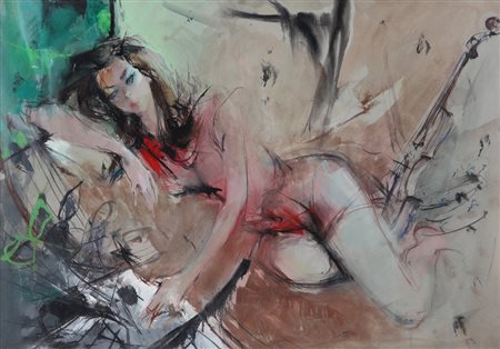 MICHELE BARETTA Vigone (TO) 01/01/1916 - Vigone 14/08/1987 Ragazza distesa tecnica mista su carta applicata su tela cm. 48,5x66,5; firma in basso al centro.