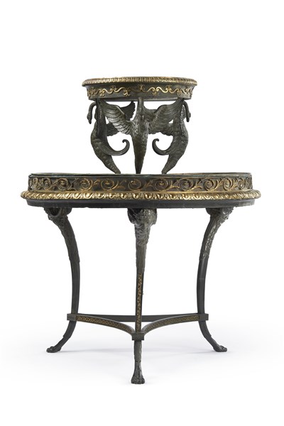 Fonderia Chiurazzi (attr.) Fioriera in bronzo brunito e dorato con vasca superiore sorretta da cigni con ali spiegate a tutto tondo, fascia traforata e cesellata a volute e unghiature, montanti a teste di satiri con fregi dorati e piedi ferini. Napoli, fine secolo XIX (h. cm 130; d. cm 105) (difetti)