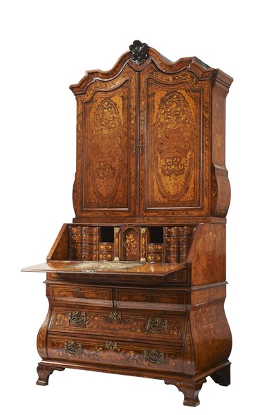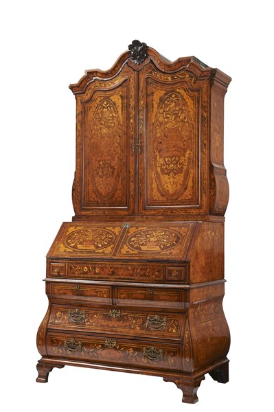 Trumeau a tre corpi, lastronato, filettato e intarsiato in legni vari con decoro a vasi di fiori e volatili entro riserve. Parte inferiore con fronte mosso a sei cassetti di varie misure, calatoia con all'interno vari cassetti mossi, anta centrale tra lesene con segreti interni. Parte superiore a due ante riccamente intarsiata a vasi con fiori e soggetti ornitologici, all'interno ripiano. Cimasa mistilinea centrata da elemento intagliato. Olanda, fine secolo XVIII (cm 112x230x70) (difetti e restauri)