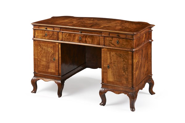 Scrivania da centro lastronata in radica di noce e radica d'ulivo, filettata in legno chiaro. Piano di forma mossa. Tre cassetti nella fascia sotto tre tiretti estraibili. Due ante rivelano due cassetti, gambe mosse. Veneto, secolo XVIII (cm 113x73x64) (restauri)