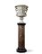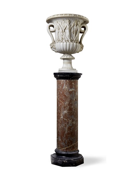 Vaso in marmo a cratere biansato, parte inferiore della vasca a baccellature e corpo scolpito a bassorilievo da corteo di vestali con sacerdote, anse con mascherone all'attacco, orlo estroflesso e ornato a baccellature, base quadrata su cui poggia il piede svasato. Roma, secolo XIX (h. cm 84) Montato su colonna in marmo (h. cm 106) (difetti)
