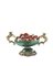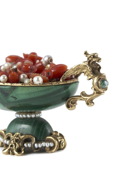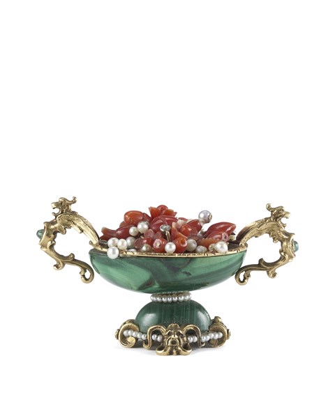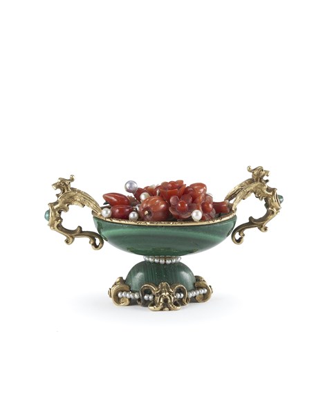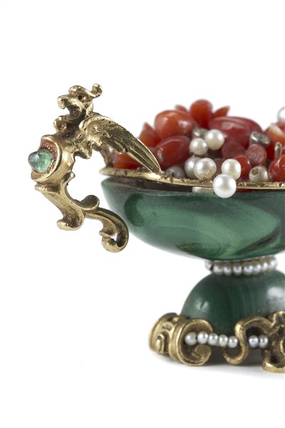Coppetta in malachite con anse in foggia di arpia, vaso contenente fiori e frutti in corallo frammisti di piccole perle, bordi profilati in oro, perline e strass. Supporto cesellato a mascheroni alternati a filo di perle, firmato alla base (cm 5x3) (difetti)