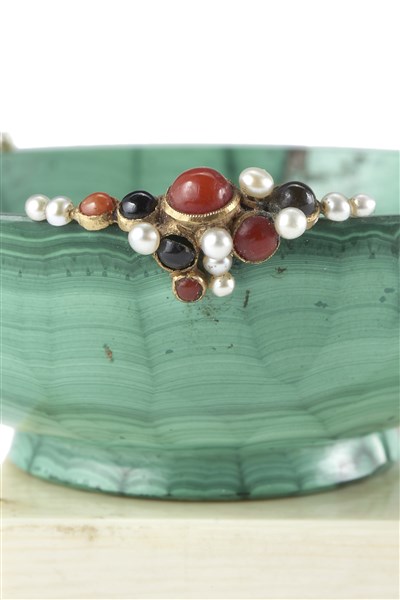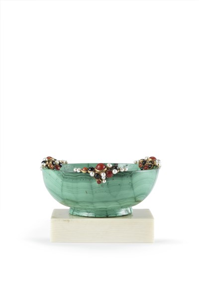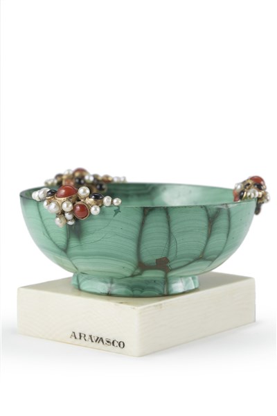 Alfredo Ravasco Coppetta in malachite con decoro in oro, onice, coralli e perle,