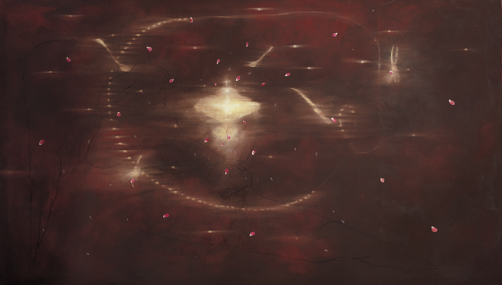 OMAR GALLIANI Montecchio Emilia (Re) 30/10/1954 Festino celeste, 1987 olio su tela cm. 147x257, firma, titolo e anno al retro, dichiarazione d'autenticità dell'artista su foto, opera senza cornice.