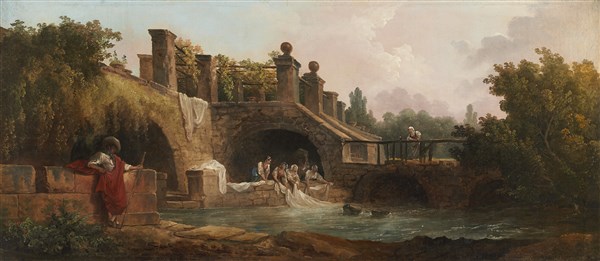 Lotto 155 | Hubert Robert Paesaggio con lavandaie presso un ponte Olio su tela, cm 51x116