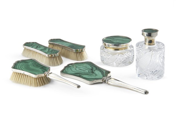 Lotto 156 | Set da toilette in argento e malachite composto da tre spazzole, specchio, port