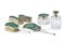Silver and malachite toiletries consisting of three brushes, mirror, powder case and perfume bottle. Title 925. Milan, silversmiths Fratelli Cacchione (defects and restorations)