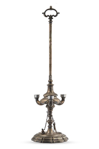 Lucerna in argento con fusto liscio su base a profilo mistilineo e gradinata. Contenitore porta olio a tre fiamme, accessori appesi alle catenelle e presa a volute contrapposte. Secolo XVIII/XIX (h. cm 65) (g lordi 1400) (difetti)