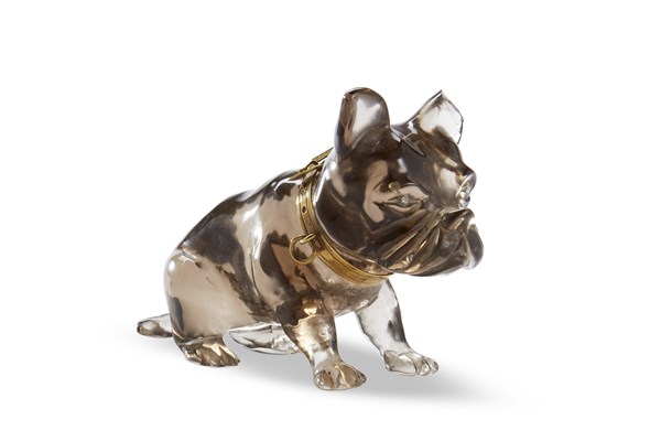 Arte russa, fine secolo XIX. French bulldog, scultura in quarzo fumè con collare in oro 18K (cm 8x6x3,5) (lievi mancanze)
