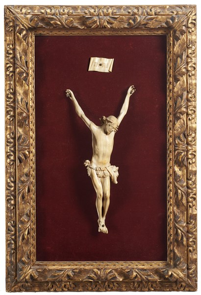 Spanish art, late 17th century. Christ crucified, carved ivory sculpture (h. cm 29) mounted on velvet panel within carved and gilded wooden frame of later period (cm 56,5x38) (minor defects)