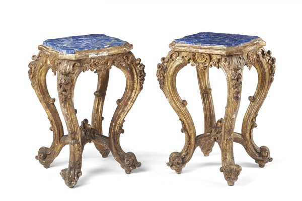 Coppia di gueridon in legno intagliato e dorato a mecca con gambe mosse terminanti a ricciolo e crociera di raccordo. Italia Meridionale, secolo XVIII. Piano sagomato lastronato in pietra dura di epoca successiva (cm 40x58,5x39) (difetti)