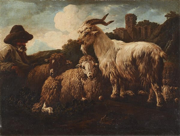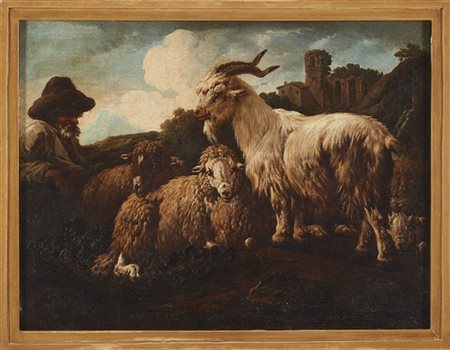 Cerchia di Rosa da Tivoli Pastore con armenti Olio su tela, cm 48,5x64 In c