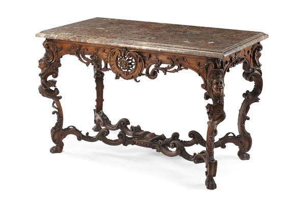 Tavolo da parete in rovere riccamente intagliato a volute e fiori, decorato al centro della fascia a medaglione traforato. Montanti anteriori di forma mossa scolpiti a teste muliebri con dragoni attorcigliati, traverse raccordate al centro da fregio con libro e strumento musicale, piedi ferini, piano in marmo. Francia, secolo XVIII (cm 132x83x69) (difetti)