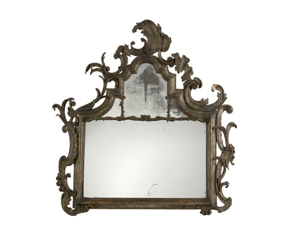 Specchiera in legno scolpito, traforato e argentato a mecca con decoro a volute fogliate, cimasa specchiata a struttura architettonica. Italia meridionale, secolo XVIII (cm 137x140) (difetti e restauri)