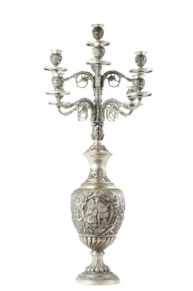 Candelabro in argento a nove fiamme con sostegno a balaustro riccamente decorato a rilievo, fronte con scena galante entro riserva, animali fantastici entro volute su tutta la fascia che si ripete nelle bobeches, bordi baccellati e a fiori, bracci a volute. Titolo 800. Punzoni visibili solo sulla chiusura del fondo (h. cm 80) (g 6500) (lievi difetti)
