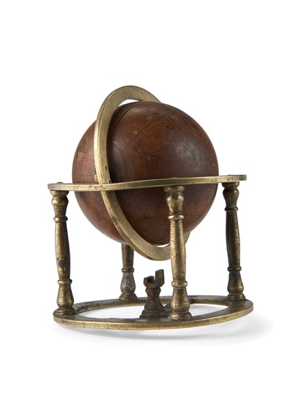 Small oak wood celestial globe with brass base with four columns. Islamic art, late 18th - early 19th century (h. cm 11; d. cm 10) (defects)