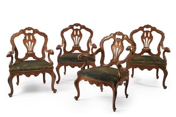 Gruppo di quattro poltrone in noce con schienale traforato e intagliato a volute e valva di conchiglia, braccioli mossi terminanti a riccioli, gambe e fasce sagomate intagliate e decorate a motivi vegetali. Veneto, fine secolo XVIII - inizio secolo XIX (difetti)