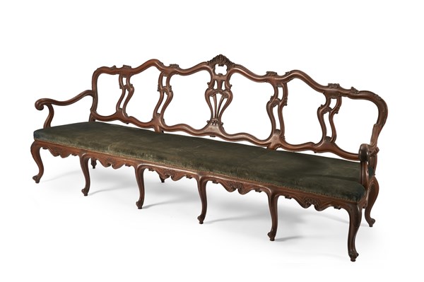 Divano da portego in noce a sei posti con schienale intagliato e traforato decorato a volute, gambe e braccioli mossi, fascia sagomata. Veneto, secolo XIX (L. cm 274) (difetti)