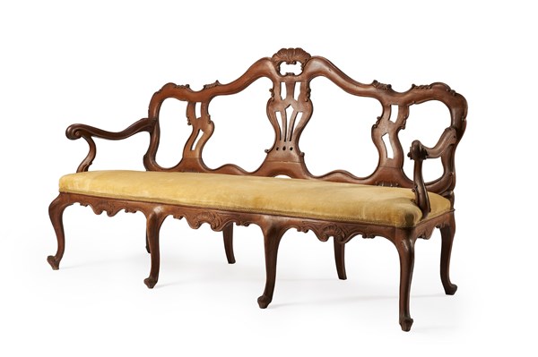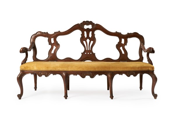 Due divani da portego a tre posti in noce con schienale a cartelle traforate, la centrale decorata da elemento intagliato, gambe e braccioli mossi. Veneto, secolo XVIII e seguenti (L. cm 189) (difetti)