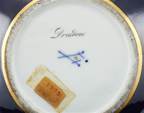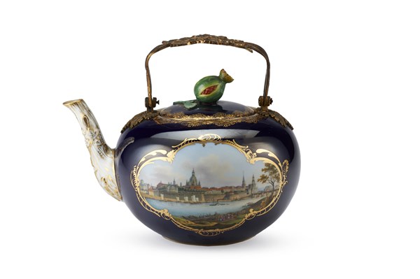 Manifattura di Meissen, secolo XIX. Teiera in porcellana a fondo blu decorata a dorature e in policromia con veduta di Dresda, fiori, foglie e farfalle entro riserve con profili in oro. Presa del coperchio a melograno a tutto tondo, ansa in metallo dorato basculante traforato a foglie. Marcata e con iscrizione alla base (cm 22x15x15) (mancanze)